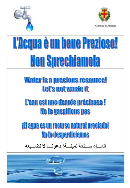 La frase, tradotta in diverse lingue, mira a sensibilizzare cittadini e turisti ad un corretto uso dell’acqua pubblica data la situazione di emergenza idrica che sta vivendo tutto il nostro comprensorio.