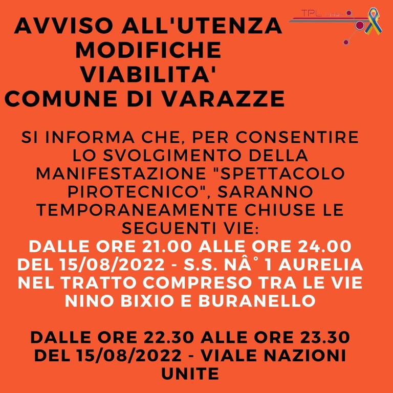 - dalle ore 21.00 alle ore 23.30 del 15/08/2022 S.S.n°1 Aurelia nel tratto compreso tra le vie Nino Bixio e Buranello.