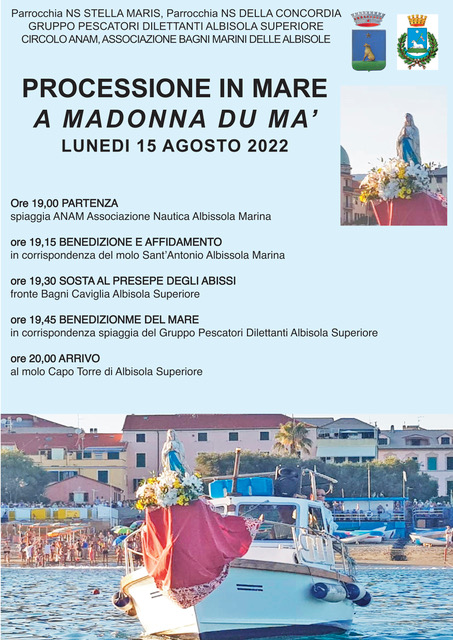 Lunedì 15 agosto, nelle specchio acqueo antistante le Albisole, si potrà assistere alla Processione della Madonna del Mare,"A Madonna du Ma'", a cura del Gruppo Pescatori Dilettanti. La partenza dalla spiaggia NAM Associazione nautica Albissola Marina è prevista alle 19, con arrivo alle 20 presso Capo Torre di Albisola Superiore.