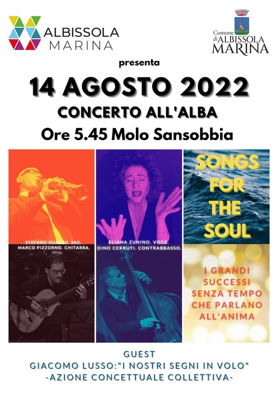 "Dall'alba al tramonto ...." con questo slogan Albissola Marina lancia la tre giorni di iniziative del Ferragosto partendo dal Concerto all'Alba delle 5,45, "Songs for Soul - canzoni per l'anima", di domenica 14 agosto presso il Molo Sansobbia sino allo spettacolo dei lumini, organizzato dai Bagni Marini delle Albisole che, come da tradizione, illumineranno tutto il litorale.