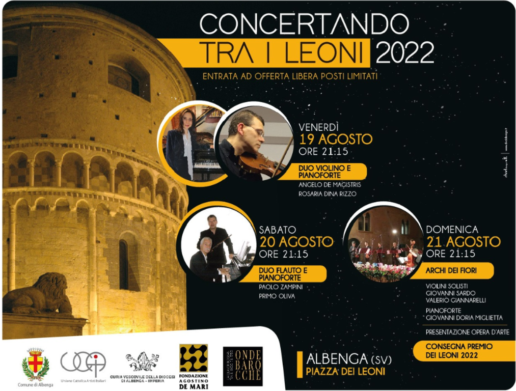 Questa sera nel cuore del Centro Storico di Albenga inizierà in Piazza dei Leoni "Concertando tra i Leoni". Una tre giorni di musica organizzata grazie alla collaborazione tra Unione Cattolica Artisti Italiani Sez. di Albenga, l'Amministrazione Comunale, Fondazione De Mari e la Curia Vescovile.