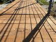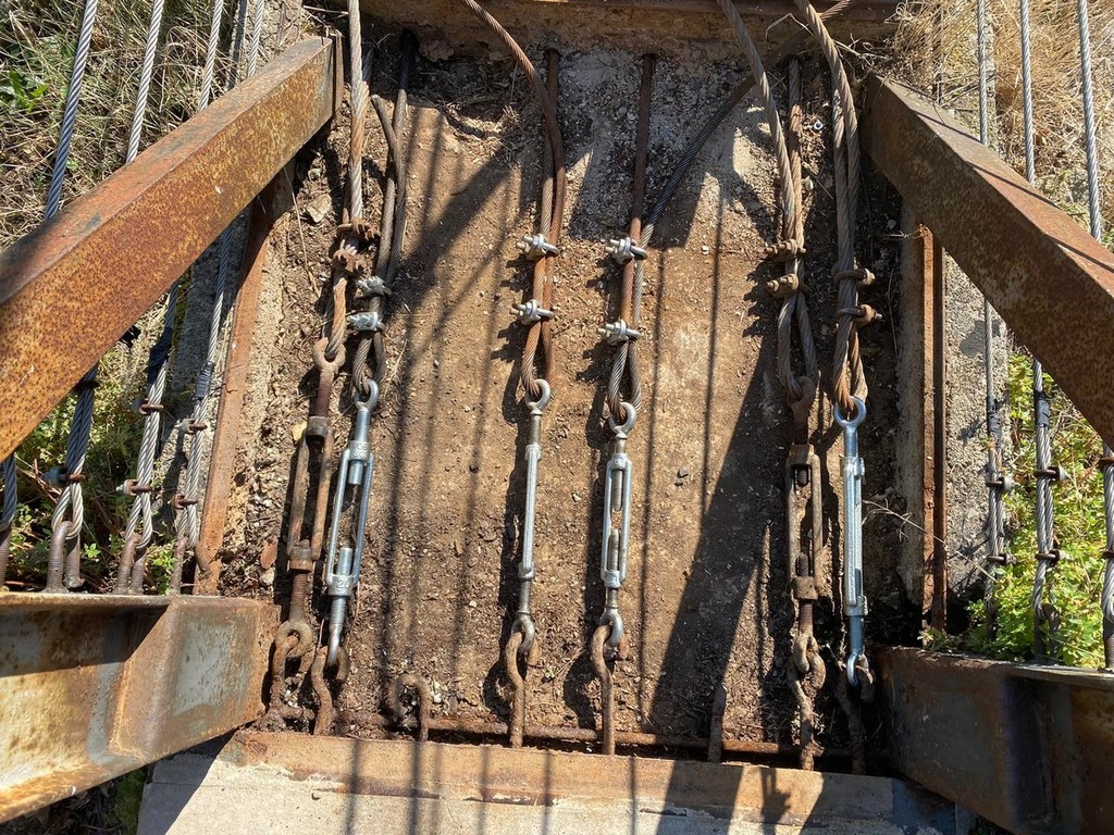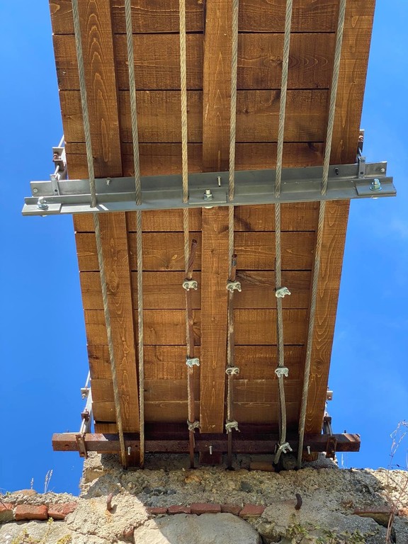 L'intervento si è concentrato sulla sostituzione degli elementi strutturali in acciaio, della struttura portante a correre in legno e del tavolato di calpestio con elementi in castagno a forte spessore, nonché la tirantatura dei cavi portanti.