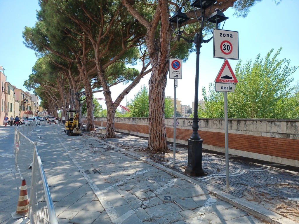 Sono iniziati i lavori di manutenzione straordinaria del marciapiede di Lungocenta Trento, ad Albenga, gravemente danneggiato dalle radici dei pini presenti.