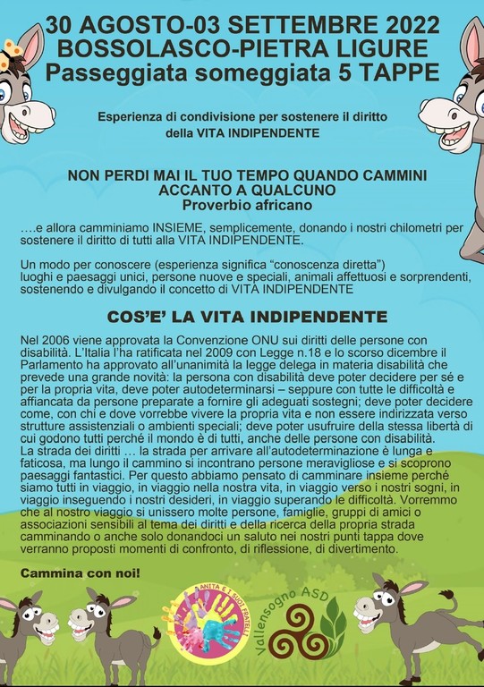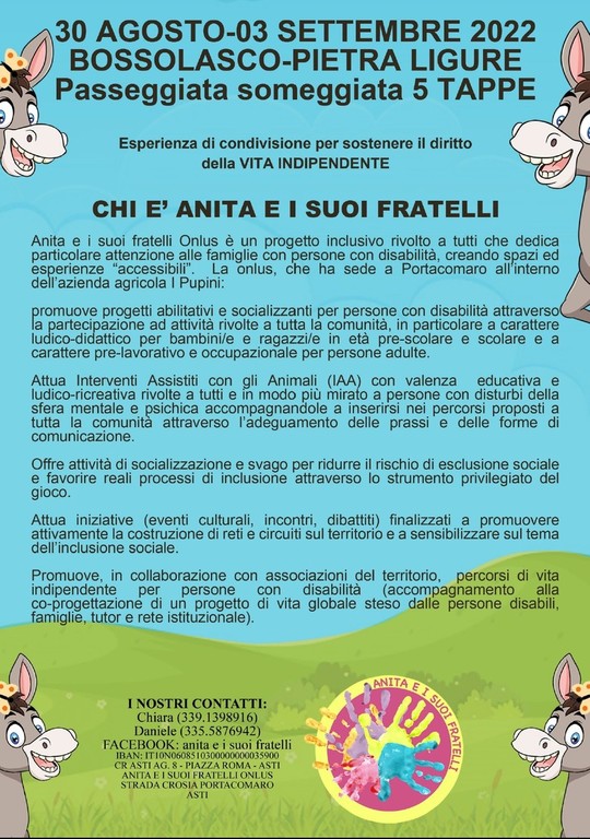 “Il Comune di Pietra Ligure è da diversi anni Bandiera Lilla e da luglio di quest’anno la prima ‘Città gentile’ della Liguria e ne siamo molto orgogliosi – continuano –. La presentazione del libro, inoltre, è il momento conclusivo della bellissima esperienza di condivisione del trekking in compagnia degli asini, partito da Bossolasco il 30 agosto u.s. e in arrivo a Pietra Ligure, dopo 5 tappe, domani, promosso da ‘Anita e i suoi fratelli Onlus’ per sostenere il diritto alla vita indipendente”.