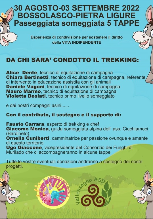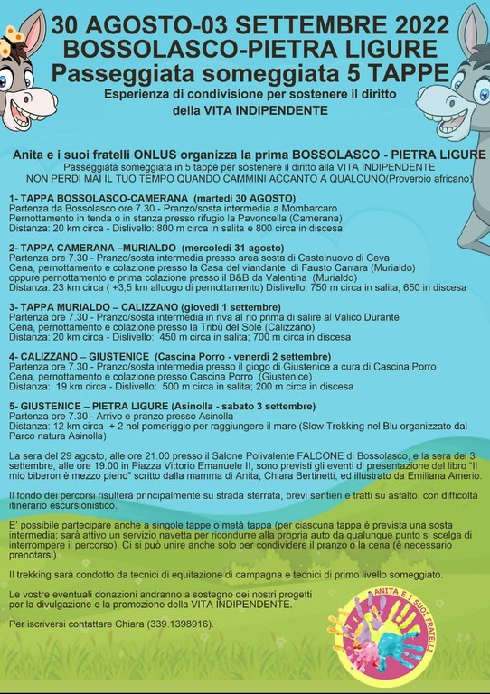 L’iniziativa, patrocinata dal Comune di Pietra Ligure e realizzata in collaborazione con la Biblioteca civica “Silvio Accame”, è organizzata da “Anita e i suoi fratelli” Onlus e dall’asd “Vallesogno”, in chiusura della prima edizione della “Passeggiata someggiata in 5 tappe Bossolasco – Pietra Ligure”.