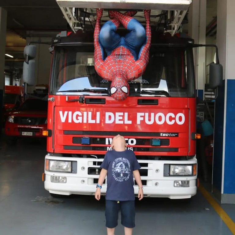 "Quel giorno in ospedale mi dicesti che uno dei tuoi più grandi sogni era quello di diventare da grande un vigile del fuoco e dunque eccoci qua - ha aggiunto il popolare super eroe - Devo essere sincero, questa volta io ho fatto poco perché il grande lavoro è stato fatto da questi ragazzi che volontariamente hanno organizzato una giornata magnifica. Siamo andati sull'autoscala e abbiamo raggiunto i trenta metri toccando il tetto del castello, abbiamo visto come gestire una bombola di gas in fiamme e come spegnere il fuoco con la manichetta antincendio. Ti abbiamo nascosto e fatto trovare dai magnifici cani da ricerca che ci hanno dimostrato l'utilità e la bellezza del loro lavoro,abbiamo guidato il drone, visitato il museo e alla fine del percorso ci hanno fatto trovare una gustosissima merenda".