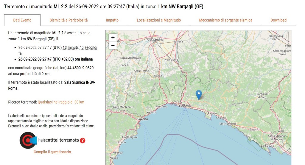 Nuova scossa di terremoto nel genovesato. Questa mattina alle 9.27 il sismografo ha registrato un sisma del 2.2 della scala Richter con epicentro ancora una volta a Bargagli.