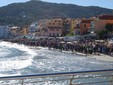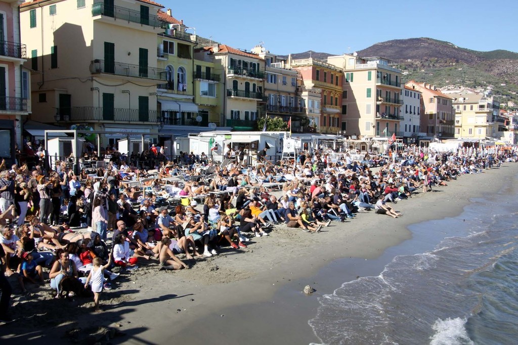 Un perfetto cielo di un tenue indaco, col sole splendente a riscaldare col suo tepore autunnale le migliaia di persone assiepate sulle spiagge, sui moli e sulle passeggiate delle due località della Baia del Sole, ha accolto così dopo un paio d'anni d'atteso nella nostra Riviera di Ponente lo show delle "Frecce Tricolore" con le loro acrobazie a disegnare un enorme bandiera italiana col loro fumo colorato.