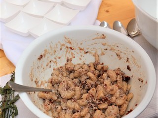 Per realizzare il piatto dello show cooking, Stefania si è ispirata alla nonna materna ed ad una preparazione molto presente nella cucina bianca, tanto da poter essere considerata il piatto tipico delle Alpi Marittime, i Sugeli. Una pasta semplice di sola acqua e farina lavorata a gnocchetti con il tipico “corpu de diu” (l’aspetto è simile a quello delle orecchiette). Il condimento tradizionale è una salsa bianca a base di bruzzo.