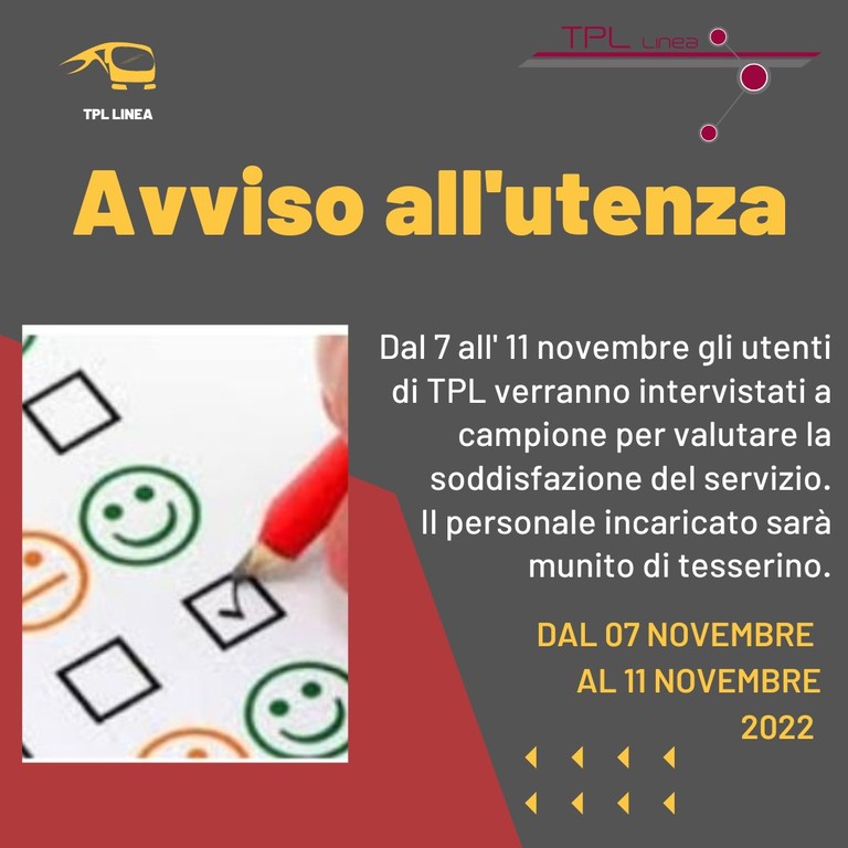 La rilevazione avviata da TPL Linea non ha alcuna finalità di natura commerciale, sarà effettuata in forma assolutamente anonima e richiede davvero pochi secondi nelle risposte da parte dell’utenza.