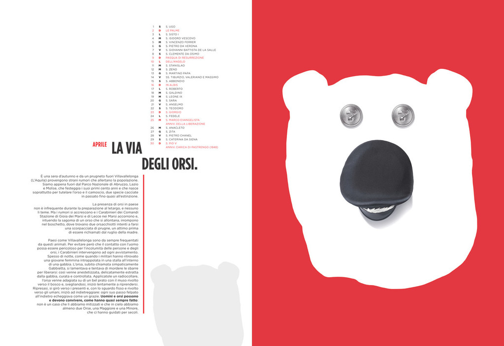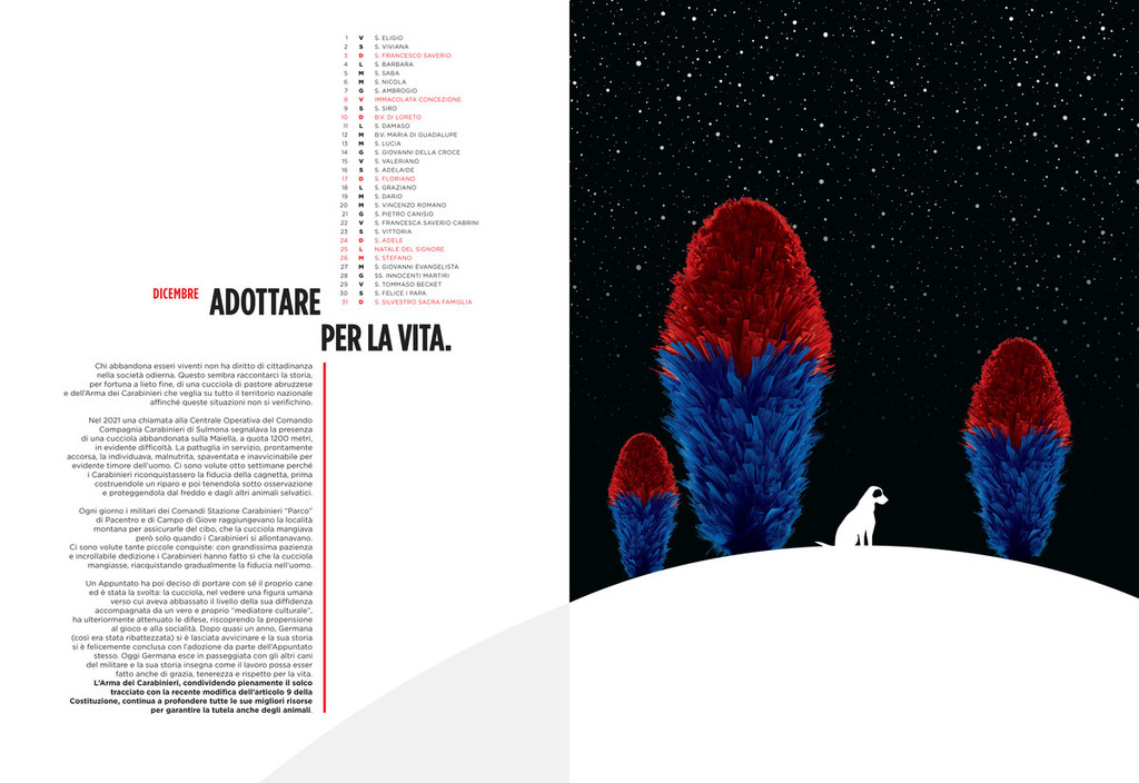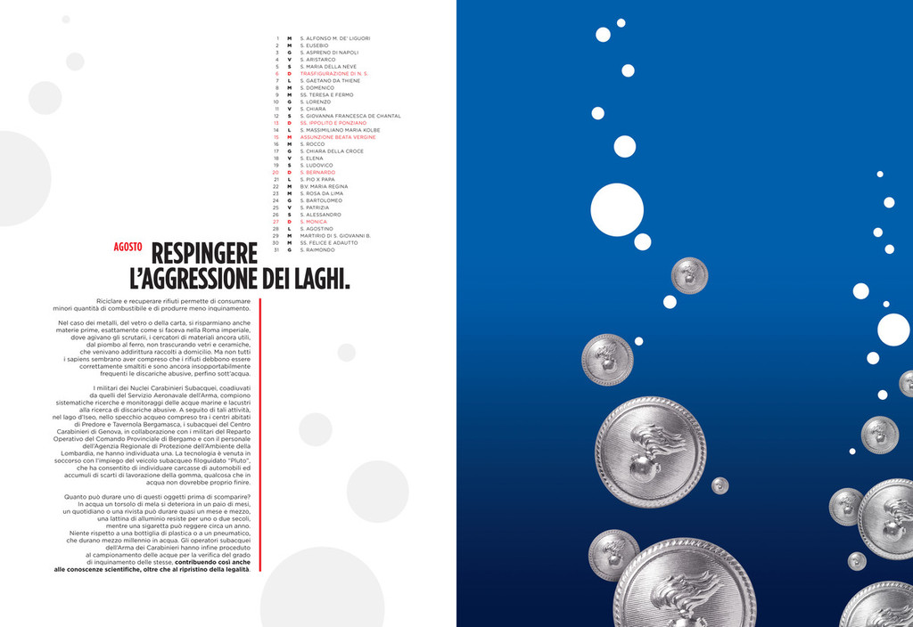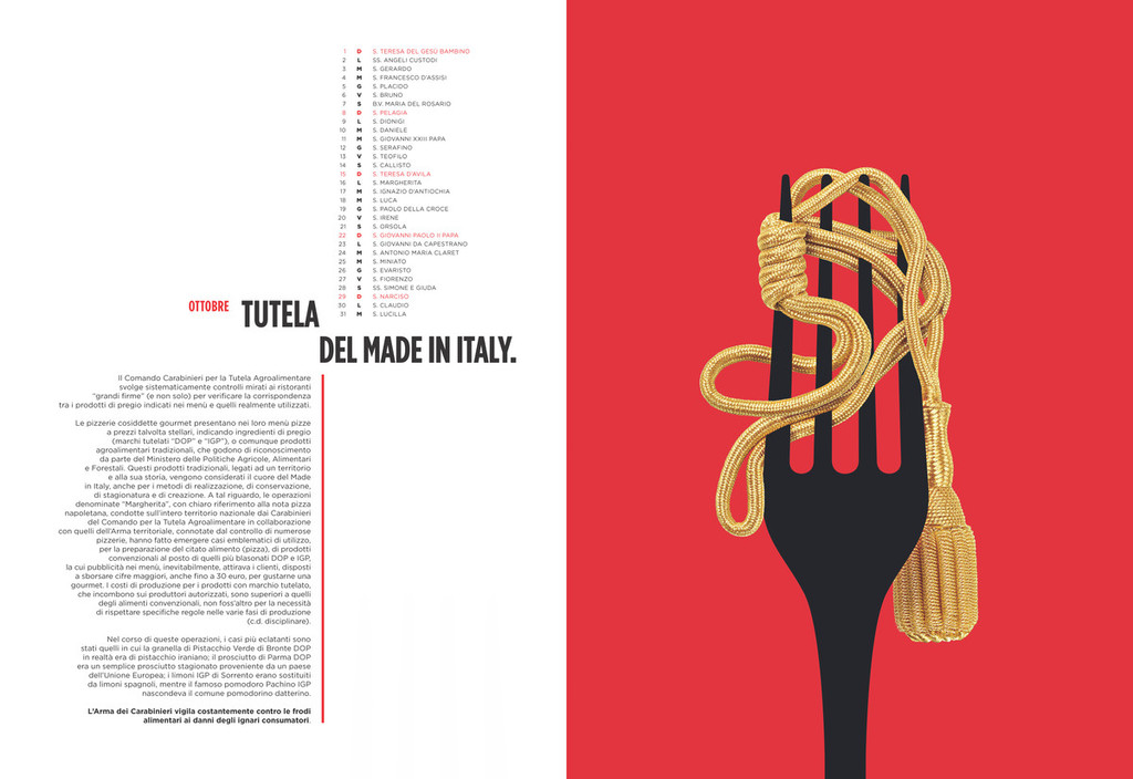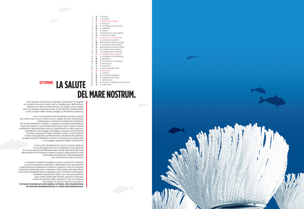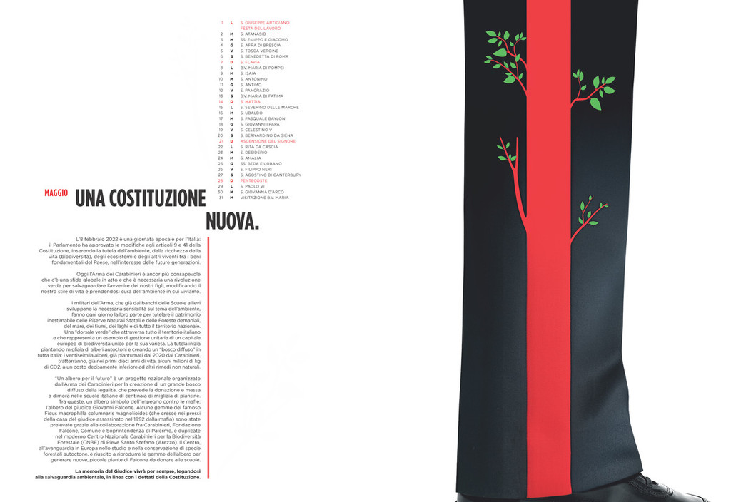 "Mi sento di dire che l’Arma con le sue articolazioni è parte attiva nel perseguire gli obiettivi di questa sfida ecologica. Attenzione che si è ulteriormente rafforzata nel 2017. L’acquisizione delle competenze e delle risorse del Corpo Forestale dello Stato, una fra le più antiche e prestigiose Istituzioni del nostro Paese, ha fatto dei Carabinieri la più grande Forza di polizia ambientale d’Europa. Attualmente il Comando Unità forestali ambientali e agroalimentari, con circa 7000 donne e uomini, opera a tutela della qualità della vita e degli ecosistemi: dalla lotta alle ecomafie al contrasto all’inquinamento; dalla prevenzione incendi alla tutela delle acque; dalla contraffazione alimentare alle frodi comunitarie; dalla salvaguardia delle specie in via d’estinzione alla custodia delle riserve naturali e dei parchi. Si aggiunge poi l’impegno in campo internazionale per promuovere la sensibilità e la cultura ambientale per la salvaguardia del pianeta - continua - Il progetto di questo calendario porta la firma dell’agenzia Armando Testa con l’inconfondibile stile che fa della sintesi, del paradosso visivo e della ricerca sull’immagine la sua cifra stilistica da decenni. Ciascuna delle tavole artistiche del calendario parte da un elemento appartenente all’universo visivo dei Carabinieri, rivisitato e interpretato in una chiave iconica. L’obiettivo è raccontare i temi legati al quotidiano lavoro dell’Arma con un’impronta di eleganza, pulizia formale e sintesi visiva che ne accentua la componente istituzionale".