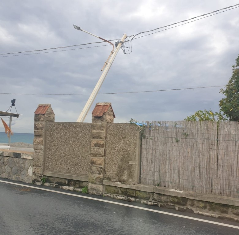 Un capannone scoperchiato ad Albenga, diversi alberi pericolanti e un palo della luce abbattuto tra Borgio Verezzi e Pietra Ligure, nei pressi della Casa Valdese.