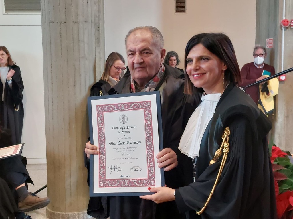 Queste le premiazioni conferite questo pomeriggio nella Sala Convegni del Tribunale di Savona e che hanno visto consegnate la medaglia alla memoria per l'avvocato Antoniobenedetto Chirò mancato un anno fa (ritirata dal figlio avvocato Domenico) e per i 50 anni di avvocatura la medaglia d'oro a Rosavio Bellasio.