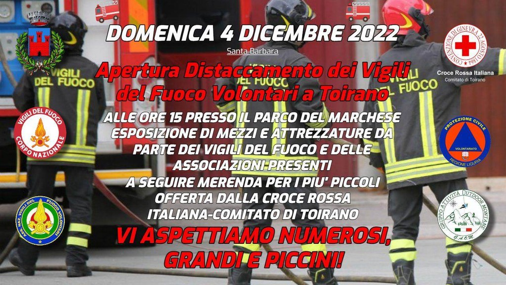 Domenica 4 dicembre, alle ore 15.00, in occasione della ricorrenza di Santa Barbara, la santa eletta patrona dei Vigili del Fuoco, a Toirano, nelle ex scuole Polla nel centro storico, verrà inaugurata la sede del distaccamento dei volontari della zona del ponente savonese.