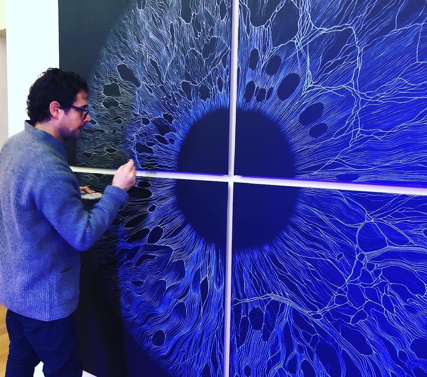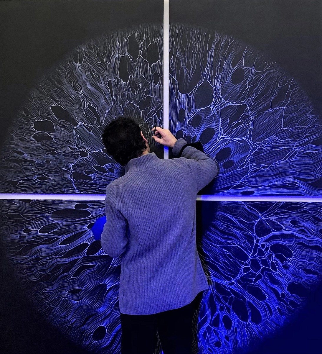 NE: ho in programma un evento personale in occasione di ARTEFIERA a Bologna presso la galleria di arte moderna e contemporanea Di Paolo Arte. In questo frangente porterò avanti il mio lavoro di arte e scienza New Quantum realizzato con una particolare forma di pittura luminescente su tela. Questo ciclo di opere è stato presentato anche ad Andora (SV) nell’ambito della mostra Cartografie Ottiche e Nuove Realtà. Appaiono visivamente come iridi umane ma simboleggiano l’unitarietà cosmica a varie dimensioni di grandezza e il varco di connessione tra universi paralleli e comunicanti.