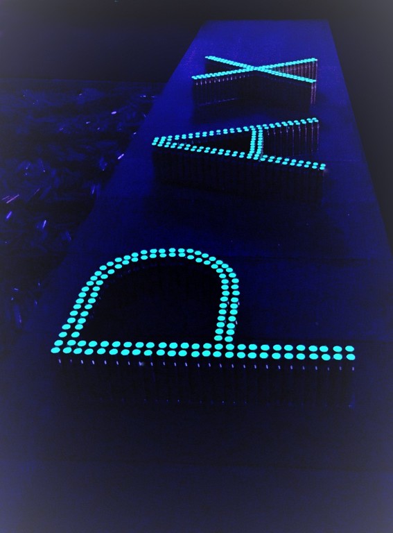 NE: nel passaggio dalla fase di luce ultravioletta a quella di buio, in cui la luminescenza dei fosfori prevale sul metallo, ho cercato la dematerializzazione della fisicità delle armi. Da un lato c’è l’idea del rifiuto della violenza disinnescando simbolicamente il potenziale di morte delle armi, dall’altro il desiderio di rappresentare i lati immateriali della violenza quali la “propaganda del terrore” e l’economia usata come un’arma contro i popoli.