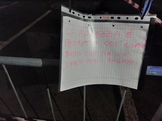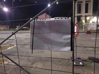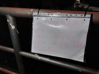 Queste le frasi che sono state scritte e posizionate con fogli e fascette sul cancello d'ingresso del campo, all'inizio di via Lavadore e nell'area transennata sotto i piloni autostradali che sarà riservata agli scuolabus.