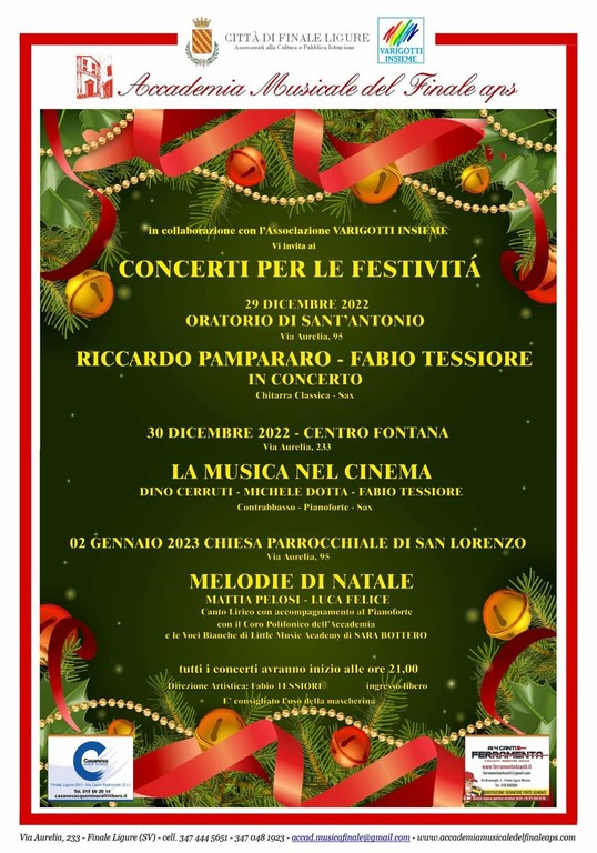 I Concerti per le Festività continuano: l’Accademia di Musica del Finale propone in collaborazione con l’Associazione "Varigotti Insieme" tre appuntamenti.