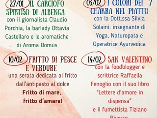 La rassegna gastronomica “I venerdì dell’Osteria” promossa dalla chef Cinzia Chiappori e dalla sommelier Miranda Moroni, prosegue anche quest'anno. Il programma prevede per la serata di venerdì 27 gennaio un menù a base di carciofi. La cena sarà accompagnata dallo storytelling del giornalista Claudio Porchia ed in apertura un cocktail preparato dalla barlady Ottavia Castellaro con le erbe aromatiche di Aroma Domus di Albenga.