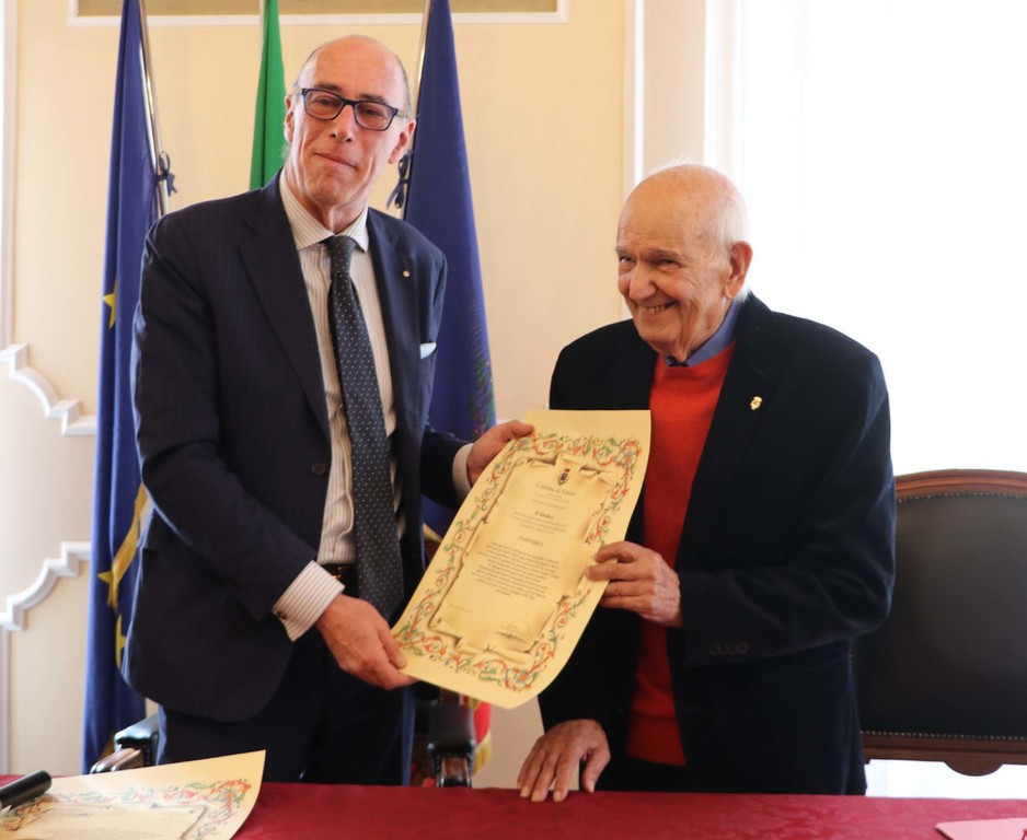 Questa la pergamena che è stata consegnata oggi nelle mani dell'ex Comandante del corpo dei Vigili Urbani alassini, al termine di una cerimonia svoltasi presso la Sala Consigliare del Comune di Alassio alla presenza di tutti i comandanti che da allora si sono succeduti alla guida del corpo municipale.
