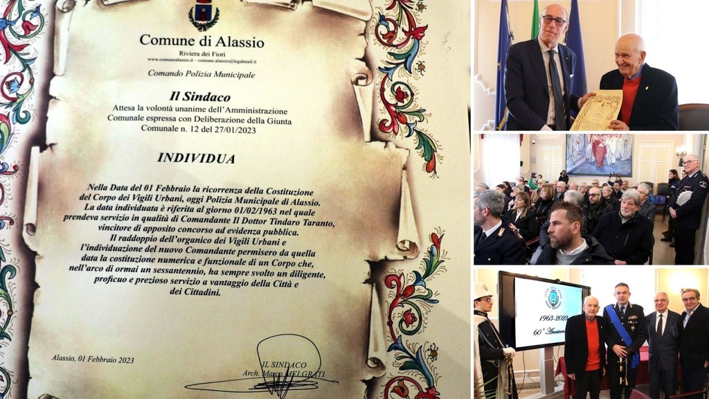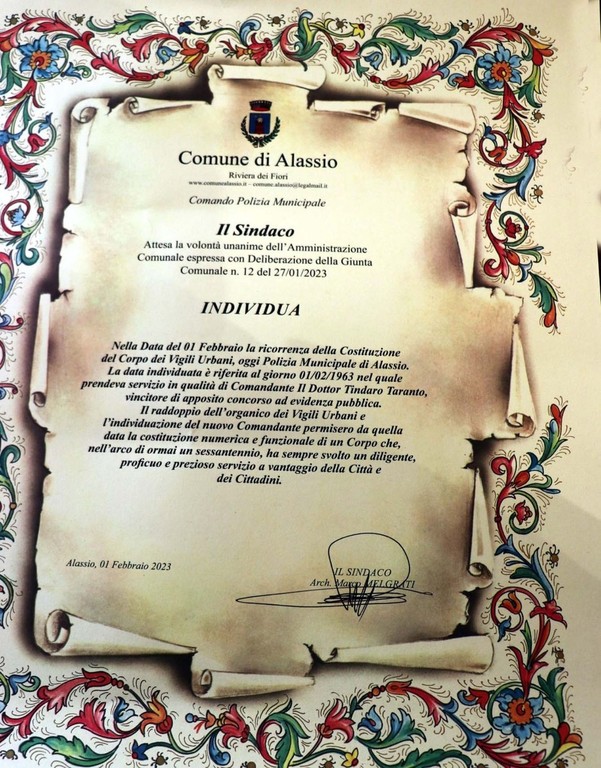 "Il Sindaco, attesa la volontà unanime dell'Amministrazione Comunale, individua nella data del 1 febbraio la ricorrenza della Costituzione del Corpo dei Vigili Urbani, oggi Polizia Municipale di Alassio. La data individuata è riferita al giorno 1° febbraio 1963, nel quale prendeva servizio in qualità di Comandante il dottor Tindaro Taranto, vincitore di apposito concorso ad evidenza pubblica.