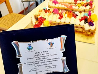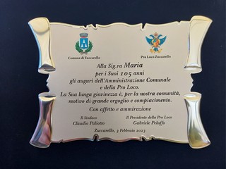 Una targa commemorativa il regalo di compleanno riservato a Maria: "La sua lunga giovinezza è, per la nostra comunità, motivo di grande orgoglio e compiacimento" si legge sull'omaggio consegnato da amministrazione e Pro Loco.