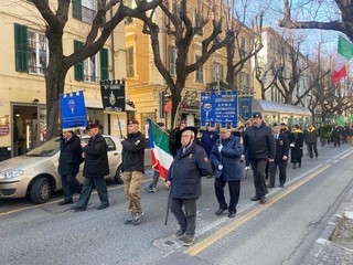 Una protesta civile e silenziosa da parte dei Fieui di caruggi di Albenga oggi in piazza XX Settembre, davanti al monumento all'Alpino, in occasione della commemorazione della battaglia di Nikolayewka voluta, come ogni anno, dal Gruppo Alpini di Albenga.