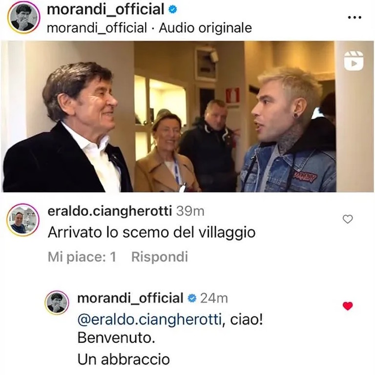 Iconica la prontezza di Morandi, che taggando Eraldo Ciangherotti, risponde: "@eraldo.ciangherotti, ciao! Benvenuto. Un abbraccio". Difficile immaginare replica più sferzante, che include l'hater nel "villaggio" da lui stesso evocato o, a seconda dell'interpretazione, rimanda al mittente proprio l'insulto.