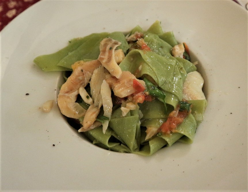 Nei Maltagliati alla Borragine, la mano della chef è perfetta, riuscendo a tenere in delicato equilibrio lo stoccafisso fra olive taggiasche e pinoli.