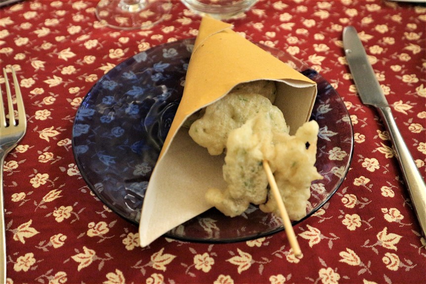In apertura le deliziose frittelle di baccalà, dove la maggiorana si è presa il compito di limarne le spigolature del gusto;