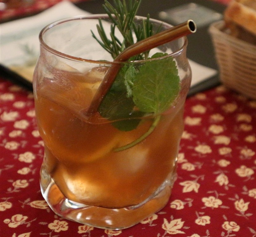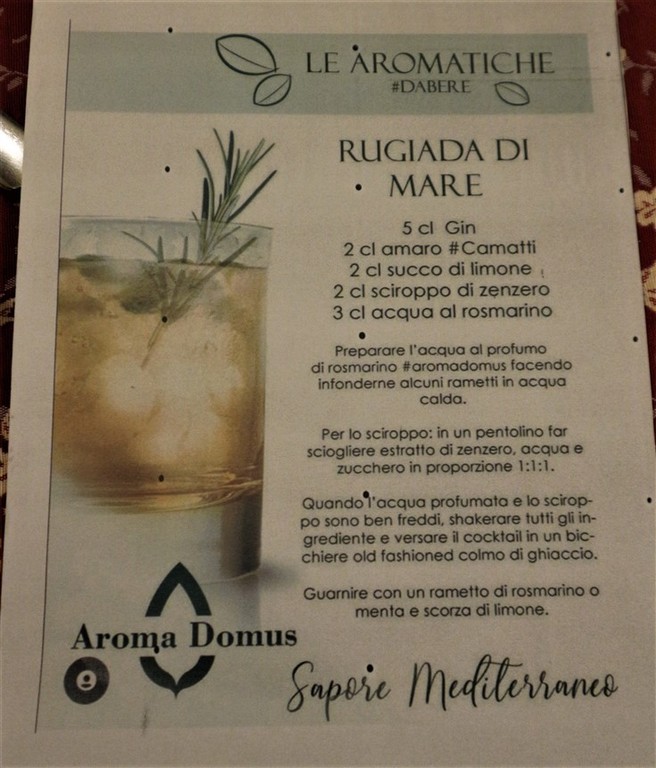 La cena è iniziata con un gradevole e stuzzicante cocktail, preparato come tradizione dell’osteria dalla barlady Ottavia Castellaro con le erbe aromatiche di Aroma Domus di Albenga. In questo caso una interessante preparazione con rosmarino, menta, zenzero e limone dal nome “Rugiada di Mare”.