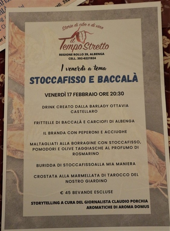 Per ulteriori informazioni e prenotazioni chiamare il numero 392-6221924. L’Osteria del Tempo Stretto si trova ad Albenga in Reg. Rollo, 39.