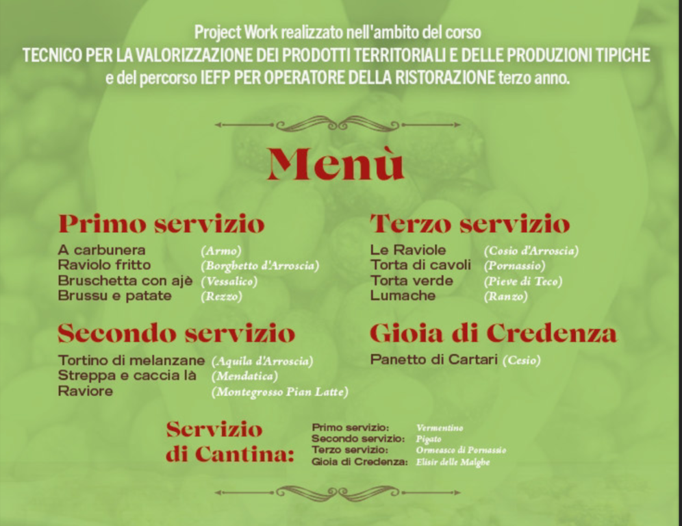 Finanziato dalla Regione Liguria, il corso è stato organizzato dall’ente SEI CPT di Imperia, in partnership con Enti pubblici, tra i quali il Parco Alpi Liguri e l'Unione dei comuni della valle Arroscia, Camera di Commercio delle Riviere liguri, Anci Liguria, associazioni, esperti e aziende, come la Raineri di Chiusanico, la cantina Ramoino di Sarola e Fratelli Porro di Pornassio e che ha coinvolto anche docenti e allievi dei percorsi IEFP per Operatore della ristorazione e per Tecnico della Ristorazione/Sala Bar.