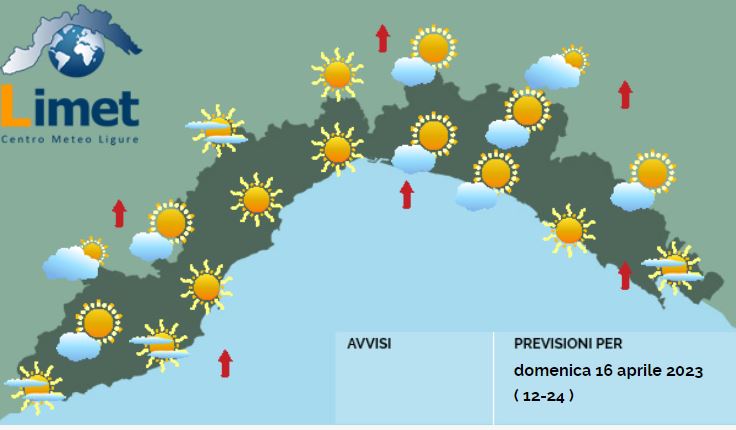 Cielo e Fenomeni: al mattino cieli in prevalenza sereni o poco nuvolosi sull'intero territorio regionale. Nel corso del pomeriggio formazione di qualche addensamento sui rilievi di Alpi Liguri ed Appennino orientale, ma con bassa probabilità di fenomeni; altrove cieli sereni o poco nuvolosi.