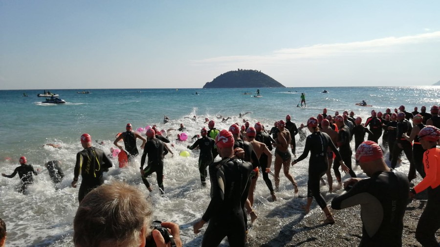 Percorso sprint 1.0 km partenza ore 14.10. Partenza dalla spiaggia di lungomare C. Colombo (lato ponente) in direzione Isola Gallinara per circa 500 metri, virata in senso antiorario e ritorno alla spiaggia di partenza; tempo limite 50 minuti.