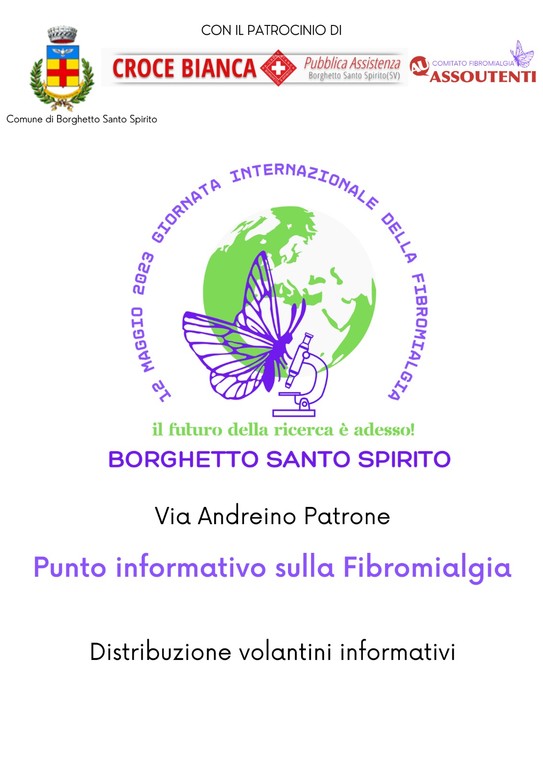Venerdì 12 maggio si celebrerà la Giornata Mondiale della Fibromialgia. Durante questa giornata, grazie anche all’interessamento di Assoutenti, la Croce Bianca di Borghetto Santo Spirito aprirà le porte alla cittadinanza e consegnerà delle brochure informative. Inoltre, la sede verrà allestita con decorazioni di colore Viola al fine di sensibilizzare circa la sindrome fibromialgica.