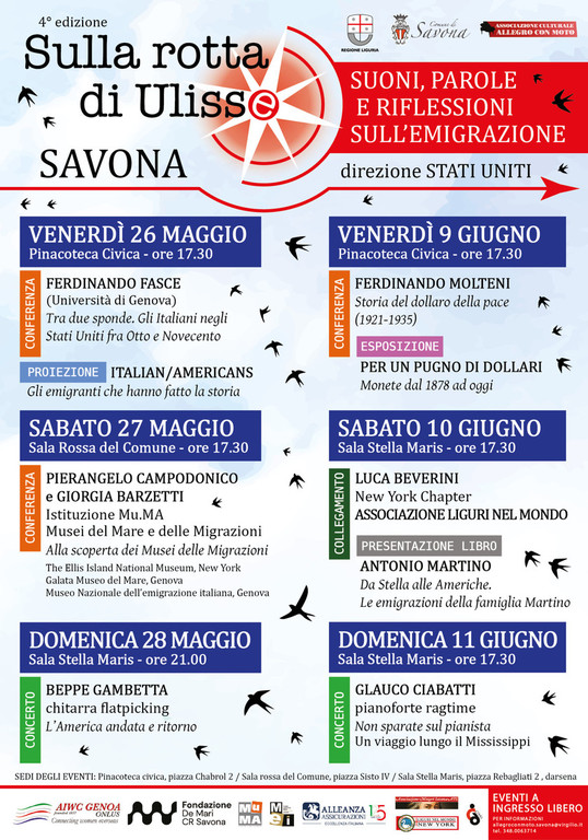 Torna per la quarta edizione la rassegna “Sulla rotta di Ulisse. Suoni, parole e riflessioni sull’emigrazione”, ideata, diretta e organizzata dall'Associazione Allegro con Moto di Savona.