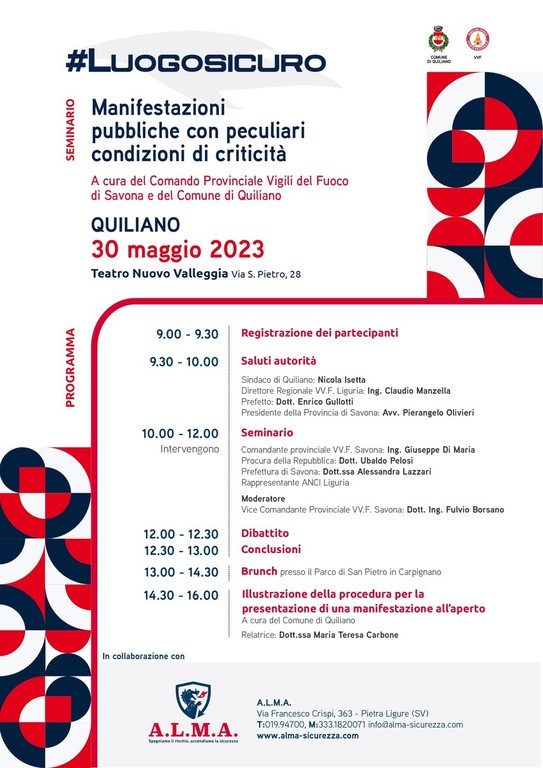 Mancano pochi giorni al seminario “#LUOGOSICURO - Manifestazioni pubbliche con peculiari condizioni di criticità”, organizzato dal Comune di Quiliano con il Comando provinciale dei Vigili del fuoco di Savona, con la collaborazione della società A.L.M.A. di Pietra Ligure, in qualità di sponsor ufficiale dell’evento.