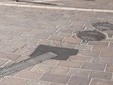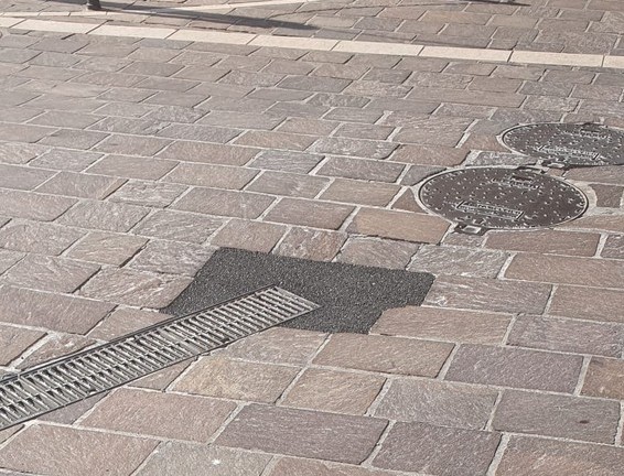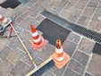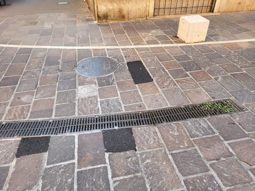E' la manutenzione provvisoria della pavimentazione tra l'inizio a ponente di via Santuario e l'intersezione con via Drione, dove sono state rimosse alcune piastrelle in pietra di cui è costituito il manto stradale per essere quindi sostituite con delle vistose chiazze di asfalto a freddo.