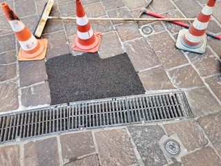 E' la manutenzione provvisoria della pavimentazione tra l'inizio a ponente di via Santuario e l'intersezione con via Drione, dove sono state rimosse alcune piastrelle in pietra di cui è costituito il manto stradale per essere quindi sostituite con delle vistose chiazze di asfalto a freddo.