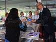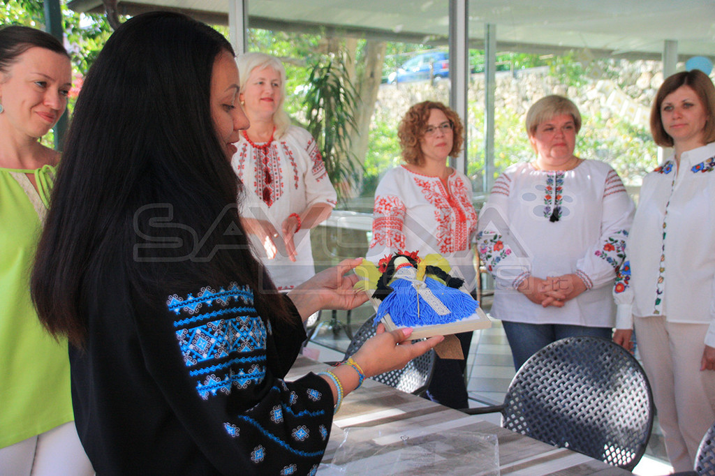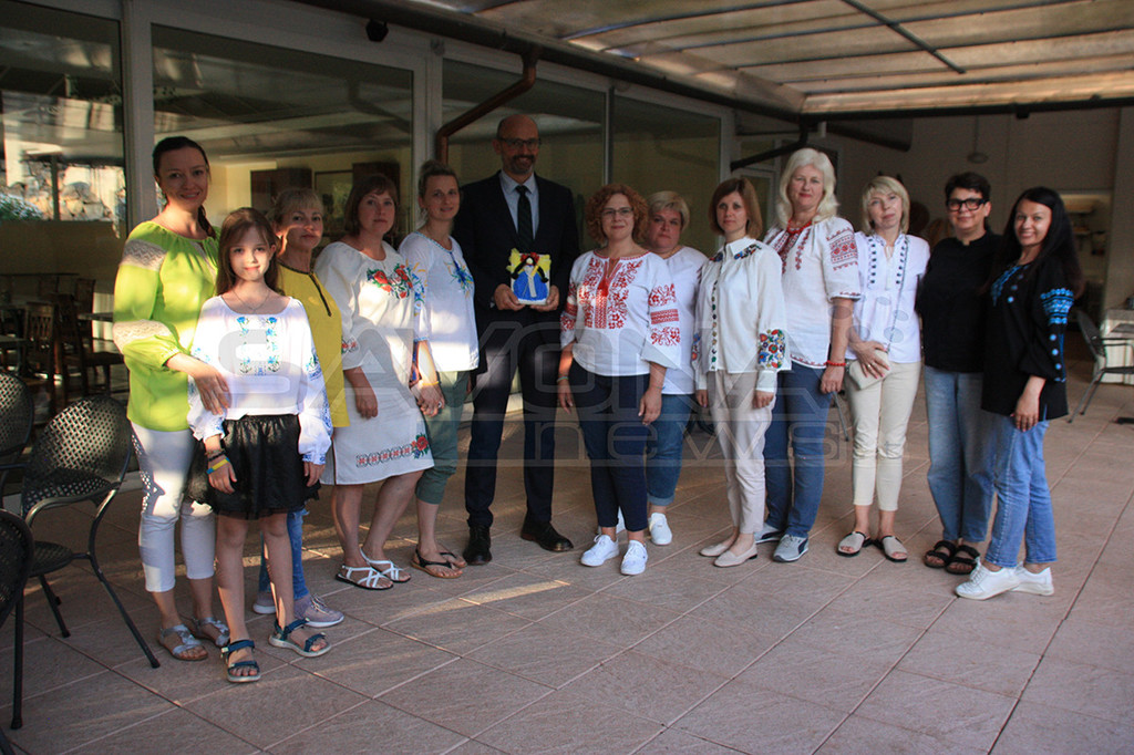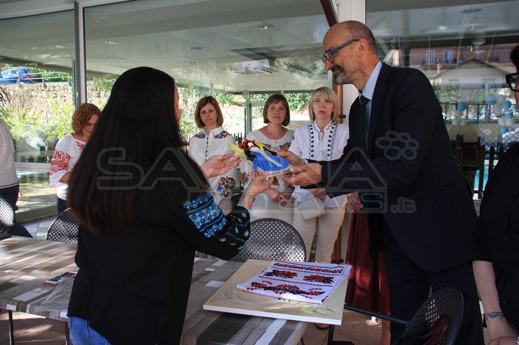 Le vedove, dignitose e fiere ognuna nella sua inappuntabile e tradizionale vyshyvanka, hanno voluto ricambiare l'accoglienza donando all'Amministrazione un quadro realizzato da un centro di riabilitazione ucraino dove l'arte viene utilizzata come terapia per contrastare gli orrori vissuti in guerra, uno speciale centro tavola e una motanka.