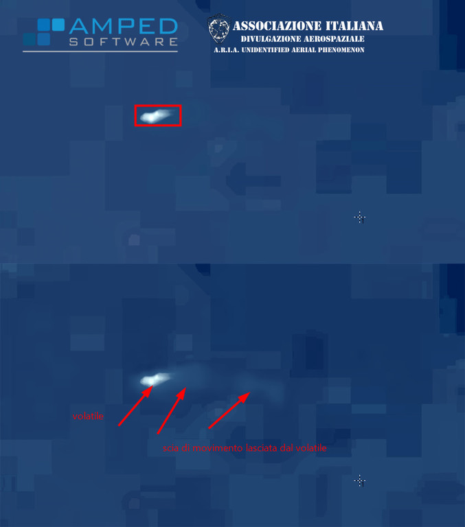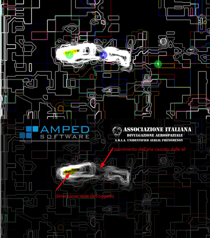 "È risaputo che a Genova, specialmente nelle zone circostanti l'aeroporto, sono presenti numerosi gabbiani. L'analisi condotta dall'A.R.I.A., utilizzando il programma forense di analisi chiamato AMPED, ha confermato senza ombra di dubbio che l'oggetto avvistato è di dimensioni ridotte (contrassegnato dal numero 1) e presenta una scia di movimento (numero 2) che, come evidenziato nella diapositiva, non è consistente, solida o compatta, non potendo quindi essere associata a un oggetto reale".