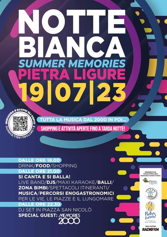 In Piazza San Nicolò, dalle 22.30, il format MEMORIES 2000 sarà l'ospite speciale della maxi discoteca sotto le stelle. Tutta la più bella musica dance degli anni 2000 farà vibrare il pubblico, creando un'esperienza unica e imperdibile per gli amanti del ritmo e del ballo. Ma non è tutto! – continua Gibbone - Numerose altre postazioni musicali e DJ, sul lungomare e nei caruggi del centro storico, proporranno i generi più amati degli anni 2000, tra house, funky, black music (rap, hip hop, trap) e tanto altro, garantendo un'atmosfera coinvolgente e indimenticabile per tutti i gusti musicali. La nostra "Notte Bianca Summer Memories" non si concentra solo sulla musica e sull'intrattenimento, ma promuove anche lo sport e il benessere con la "Sunset Kids Run", una bellissima gara podistica dedicata ai bambini che si svolgerà sulla passeggiata XX Settembre, altezza Bagni Giardino, organizzata dall’asd Runrivierarun in collaborazione con il Comune di Pietra Ligure e Facciamo Centro. Appuntamento alle ore 18.00 (iscrizioni dalle ore 17,00) per questa fantastica occasione per i più giovani di mettersi alla prova e divertirsi.
