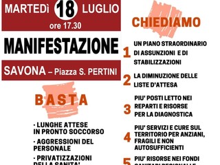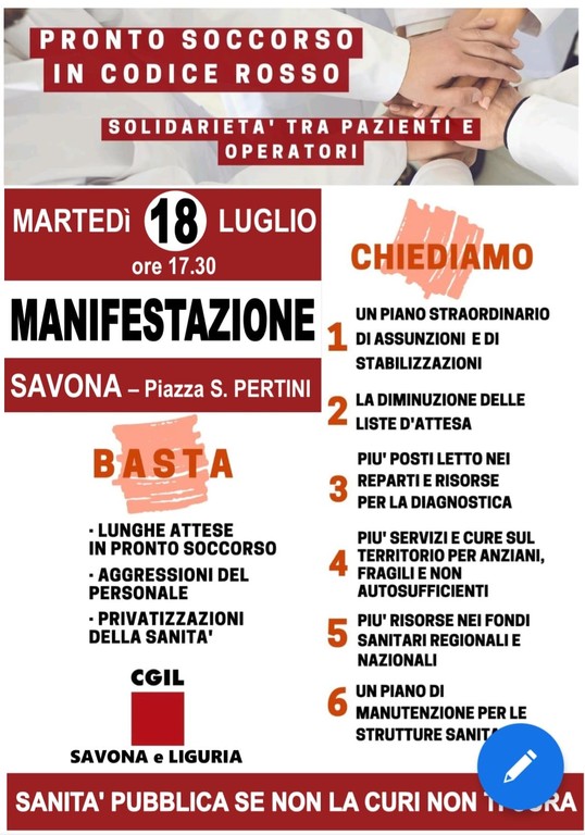 “Chiediamo invece: un piano straordinario di assunzioni; la diminuzione delle liste d'attesa; più posti letto bei reparti: più servizi e cure sul territorio per anziani, fragili e non autosufficienti; più risorse nei fondi sanitari regionali e nazionali: il ripristino delle attività ecdei servizi chiusi con il covid; Punto di primo intervento h24 a Cairo e Albenga, il punto nascite di Pietra Ligure e una discussione seria sui fondi del Pnrr”, conclude il segretario Cgil Savona Pasa.