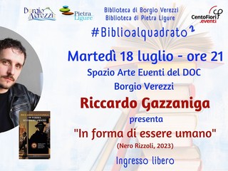 Martedì 18 luglio alle ore 21, secondo appuntamento con la rassegna estiva #Biblioalquadrato, organizzata congiuntamente dalle Biblioteche di Borgio Verezzi e Pietra Ligure: presso l’elegante Spazio Arte Eventi del DOC a Borgio, incontreremo l’autore genovese Riccardo Gazzaniga – nella vita “ordinaria” ispettore presso la Polizia di Stato - che ci presenterà l’ultima sua creazione edita da Nero Rizzoli “In forma di essere umano”. A condurre la presentazione, Stefano Sancio della Libreria CentoFiori di Finale Ligure.