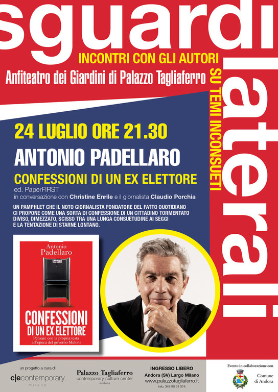 Lunedì 24 luglio 2023 alle ore 21.30 sarà il giornalista Antonio Padellaro fondatore del Fatto quotidiano a presenta il libro di fresca pubblicazione “Confessioni di un ex elettore” in conversazione con il giornalista Claudio Porchia e Christine Enrile