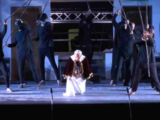 Alla presenza dell'assessore comunale alla Cultura Nicoletta Negro, il Piazzale del Maschio era gremito di spettatori, nonostante la serata infrasettimanale e un'imprevista allerta meteo. La sapiente regia di Daniela Balestra, con il suo giovane staff, è stata capace di coordinare un'ottantina di attori fra i teatranti e le numerose comparse popolari, contenute nel numero per motivi tecnici. L'opera è stata introdotta dalla stessa regista e da Ugo Folco, accennando al quadro di quella Savona dei primi anni dell'Ottocento, capitale dello strategico Dipartimento di Montenotte e scelta all’epoca dal governo napoleonico come sede di una prigionia livida e malcelata del pontefice.