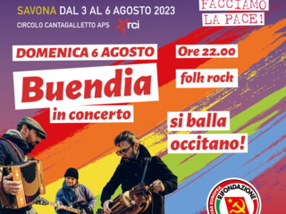Nella serata di domenica 6 agosto saranno protagonisti i “Buendia” con un concerto rock folk e con l’invito a ballare tutte e tutti quanti le melodie occitane suonate da Dario Arnaldi, Filippo Porchetto, Davide Brolpasino, Fabio Landoglia e Paolo Zebolino.