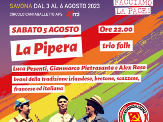 A seguire, nella serata di sabato 5 agosto, il concerto de “La Pipera“, il trio composto da Luca Pesenti, Gianmarco Pietrasanta e Alex Raso: un incontro fra i brani della tradizione irlandese, bretone, scozzese, francese ed italiana.