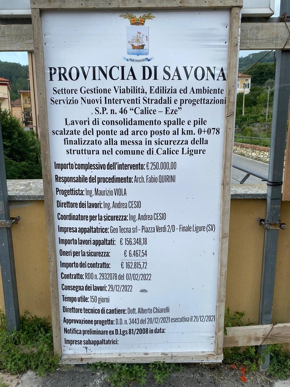 Sono terminati in questi giorni i lavori di consolidamento e messa in sicurezza del ponte che dal capoluogo del comune di Calice Ligure porta, attraverso la Sp46, alla frazione di Eze.